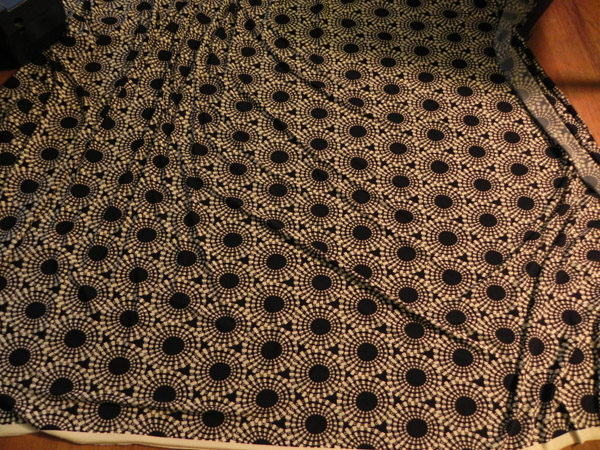 This is the fabric that I am using. I bought it when Kirsten was here and we went shopping at Fields Fabrics. It’s cute and should be great for a wrap dress. But the fabric itself…working with it is really horrible. Bad. It’s impossible to layout patterns. It’s impossible to cut. I assume it’s going to be impossible to sew.