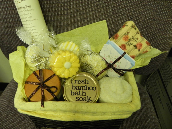 I’ve been working on a project for a coworker to give her mother. This basket contains my handmade lavender/geranium soap, geranium bath salts, fresh bamboo milk bath soak, lavender eye sachet, candy-covered oreos, spa socks and a mini notecard set.