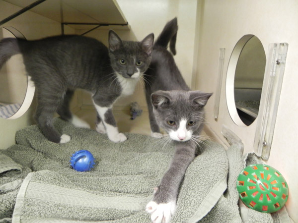 They are no longer scaredy-cats. They were fixed on Tuesday, and will probably go up on the adoptable floor Sunday or Monday. The girl (right) loves to give and get kisses. The boy loves his belly rubbed. His eyes remind me of Maxy. In this job, you should never give your heart to a kitten…they will break it every time. Hopefully these guys will do just fine, though.