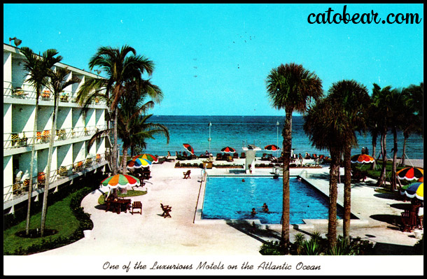 This lovely vintage postcard, featuring an un-named motel, was mailed to Mrs. G. F. Mulliins, Apt. 408, 10 Louise Ave, Highland Park (3), Mich. U.S.A. from Miami Beach July 12, 1959 using a purple three-cent liberty stamp. It reads: