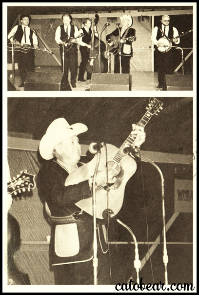 1989-16. JIMMY MARTIN (below), “King of Bluegrass”, at age 22, came to prominence while playing with Bill Monroe (1949), sang with the Osborne Brothers (1954), and formed his first “Sunny Mountain Boys” band (1955). JIMMY and his SUNNY MOUNTAIN BOYS (above) are on stage at the Poston Lake Festival, near Guysville, Ohio, 11 June 1988. Photo by Ronald L. Stuckey, Copyright 1989.