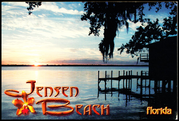 My friend Kathleen sent me this postcard from Jensen Beach, Florida (beautiful sunsets along the Indian River, photo by Martin Gordash, (c) Scenic Florida Distributors). One of the problems with modern day postmarks (have you looked at cancellations on your mail lately? really?) is that they are almost impossible to read. I can see this was sent from West Palm Beach, but there is no way of seeing the date. It does have a 42 cent stamp on it, which would likely put it mailed between May 2008 and May 2009. Kat talks about the weather, her family and how she’s been enjoying some ice cream.