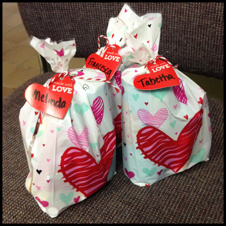 Although I was planning on a needle-felting project for the staff members for valentines gifts this year, I just couldn’t pull myself together. Instead, I put together little packages of sparkling juice, lip balm, hand lotion and sweets.